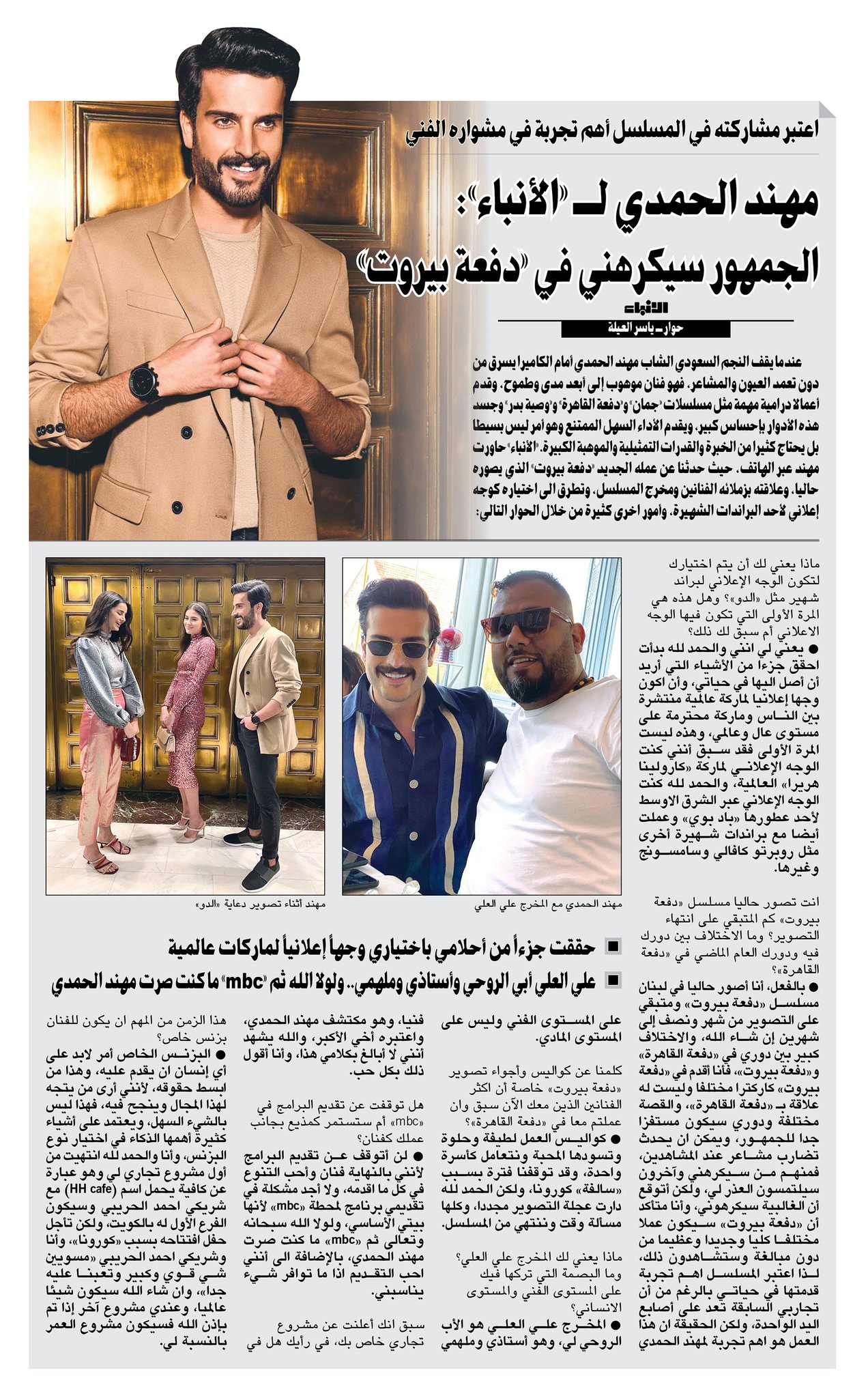 انذبحوا الناس فيك، ثم مازحته بقولها: مهند الحمدي. ويتعاون الثنائي مهند الحمدي ونور الغندور في مسلسل دفعة بيروت المنتظر عرضه في شهر رمضان المقبل، ويعد جزءًا ثانيًا من مسلسل «دفعة القاهرة» الذي حقق نجاحًا كبيرًا في شهر رمضان الماضي بعد إذاعته على فضائية «إم بي سي».